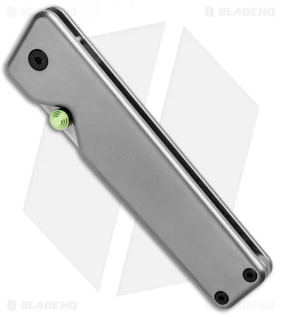 This model of the Chapter knife from The James Brand sports a gray titanium handle with a serrated satin finished S35VN blade and a green thumb stud.